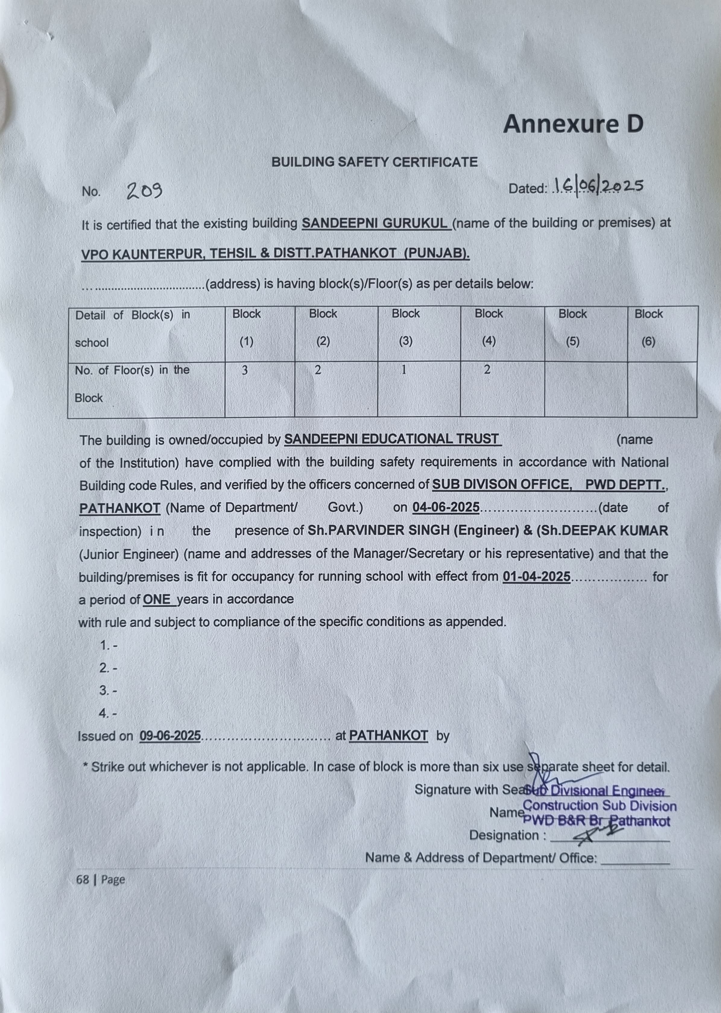 | 5. COPY OF VALID BUILDING SAFETY CERTIFICATE AS PER THE NATIONAL BUILDING CODE | Click Here |